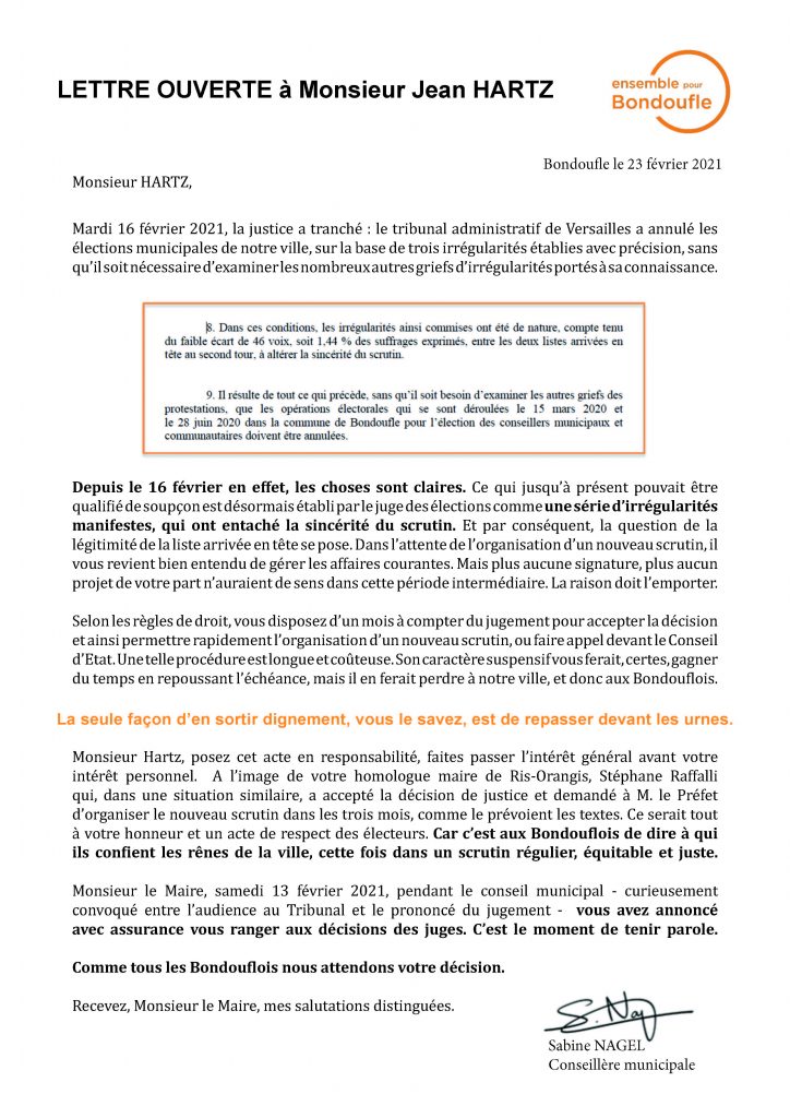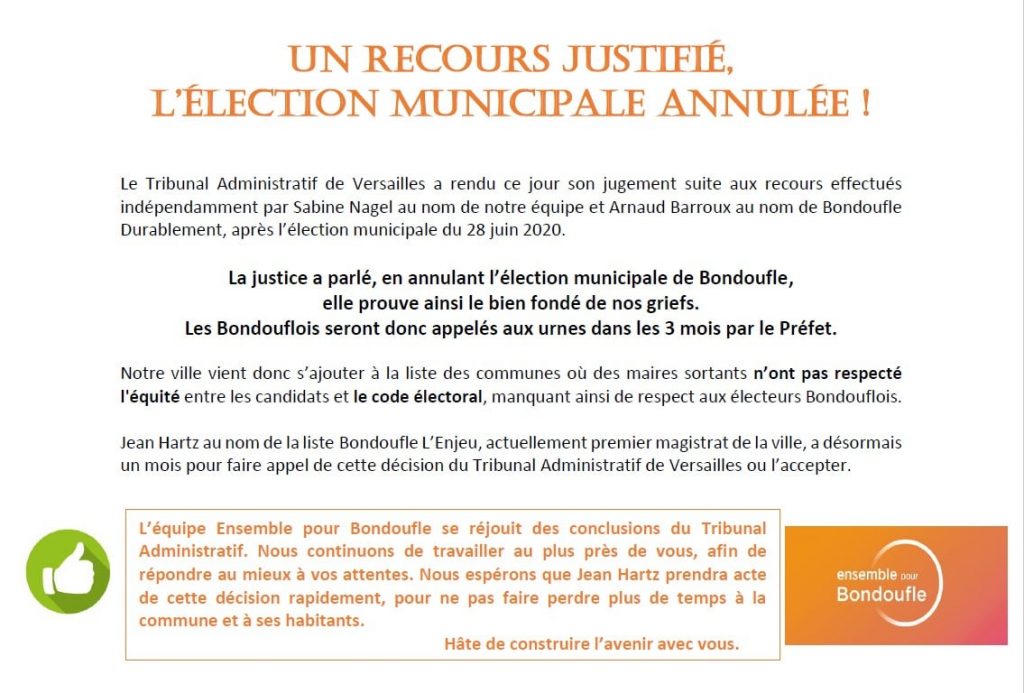 Les 46 voix seulement entre le maire sortant et notre équipe, au second tour le 28 juin dernier, nous ont permis de gagner notre recours, les juges ayant considéré que les fautes commises par le maire et ses colistiers avaient pu fausser les résultats. Nous appelons donc à un rassemblement des forces autour de la liste Ensemble Pour Bondoufle, la mieux placée pour opérer ce changement attendu.